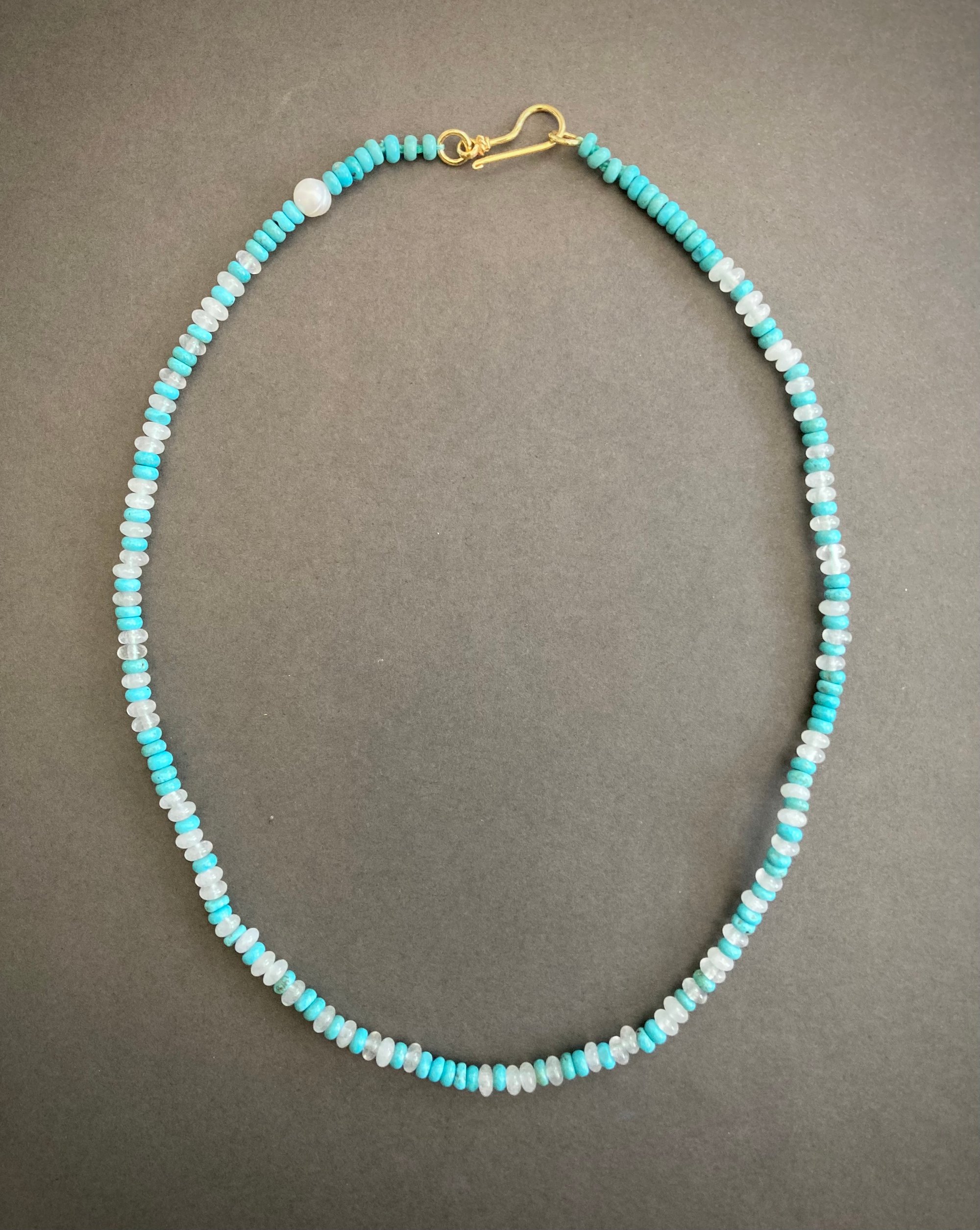 Turquoise, rock crystal and natural cultured freshwater pearl, hand knotted onto silk blend thread. Gold vermeil clasp. Approx 17”